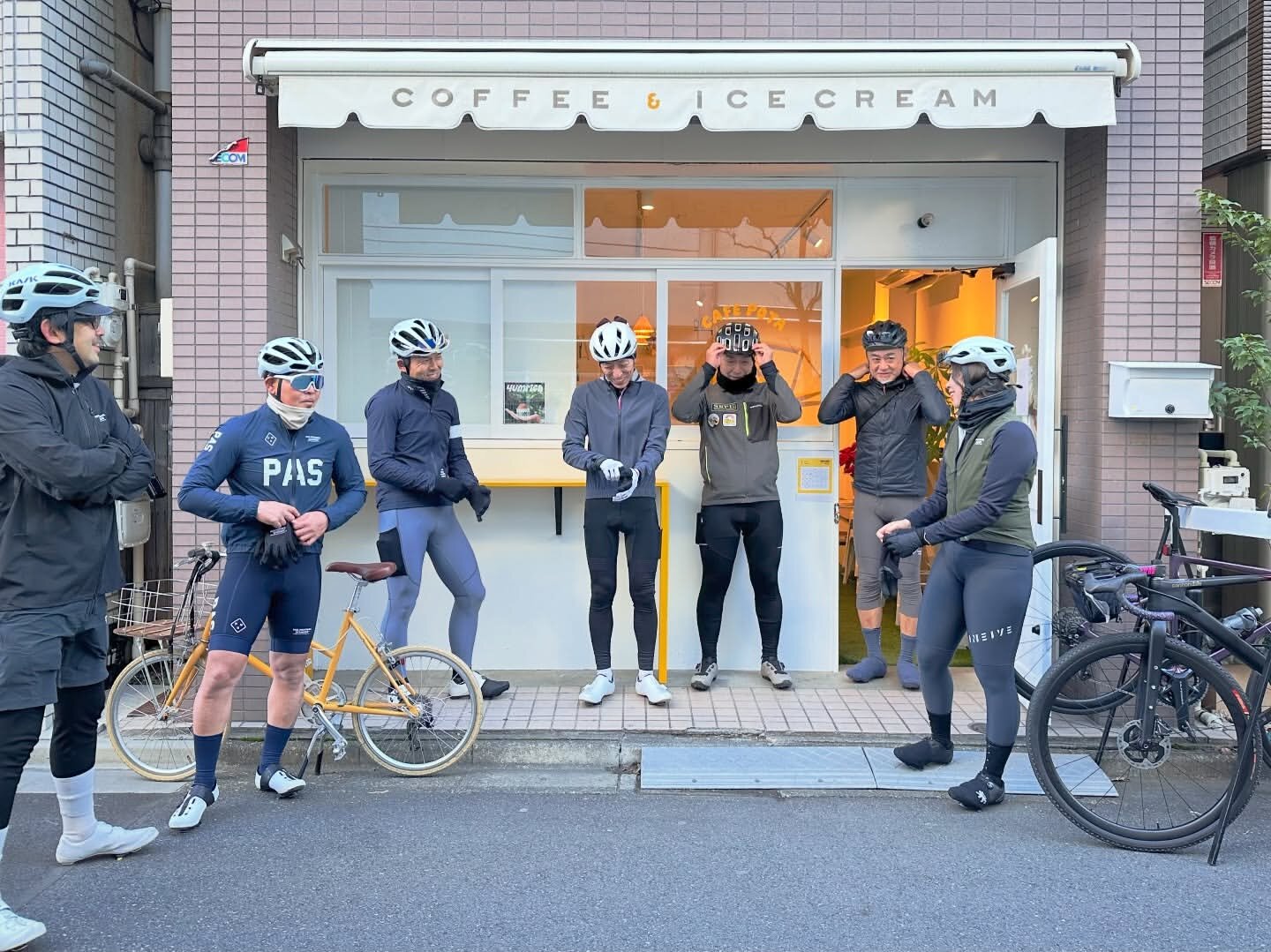 正月休みの最終日、また一段と冷え込んだ朝に浅草 cafe POTA に集合していざライドスタート!となるところですが、暖かい店内で談笑していてなかなかスタート体制にならないところで「出発前の記念撮影するよ!」の掛け声に皆さん渋々外に出て身支度している様子がこれ